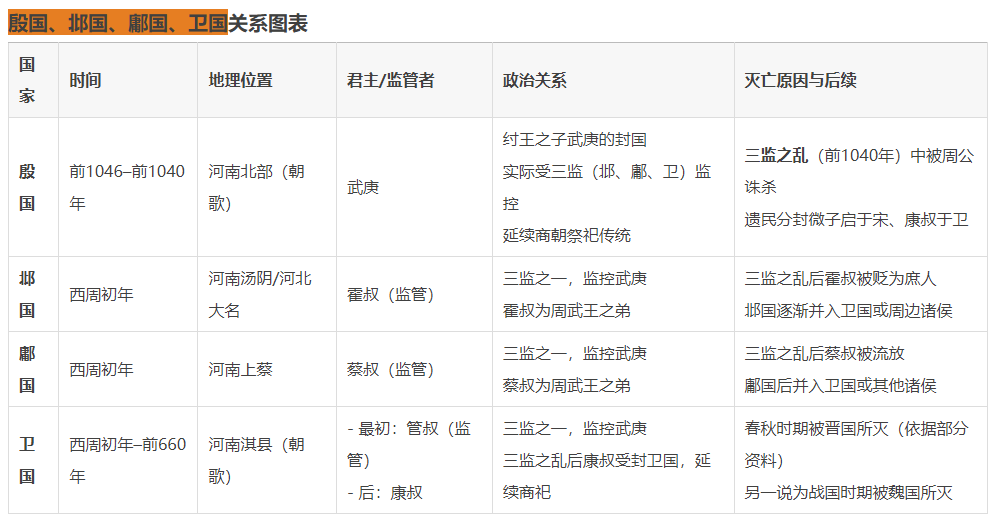 04.卫国,监管者:管叔鲜,周武王长弟,受封于管国(今河南郑州),同时被任命为“三监”之一,负责监督商纣王之子武庚及殷商遗民。 之后,二次分封,继承衣钵,正式册封卫国(部分支系)约前1040年至前209年,初封时以商遗民为主体,但国君为姬姓(康叔),部分支系保留子姓身份,后逐渐融合